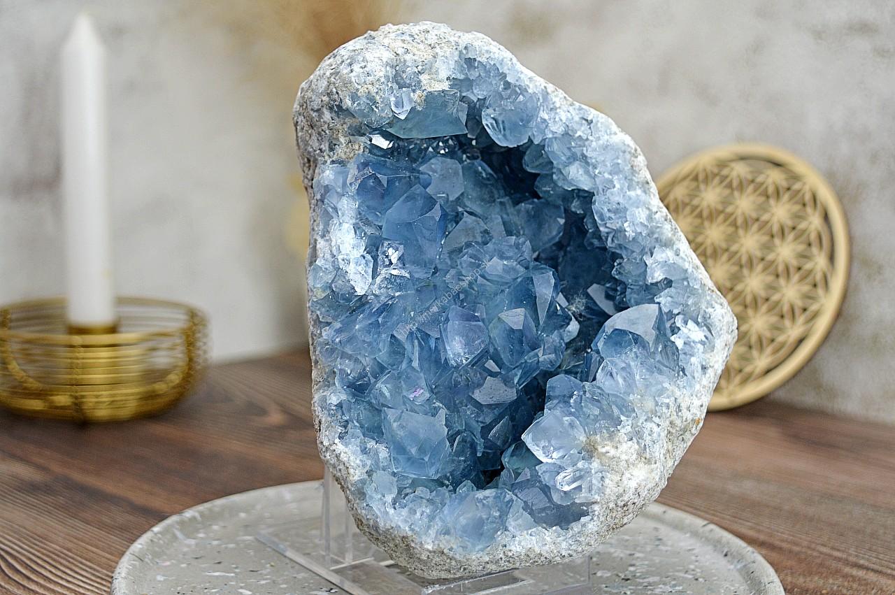 Celestín/Celestit sa vyznačuje vysokými vibráciami a funguje ako učiteľ múdrosti nového veku. Je nabitý božskými energiami. Poskytne nekonečný kľud duchovného sveta a privedie svojho majiteľa do kontaktu s ríšou anjelov. Prudko naštartuje duchovný vývoj a podnieti vás, aby ste sa vydali na cestu smerujúcu k duchovnému osvieteniu. Ukludňuje úzkosti. Harmonizuje energie Jin a Jang. Prináša pocity vnútorného pokoja a mieru. Pracuje a uvoľňuje s energiami, ktoré uviazli v našej aure.