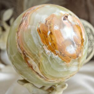 Krásne opracovaná guľa zo Zlatého Ónyxu + plastový podstavec