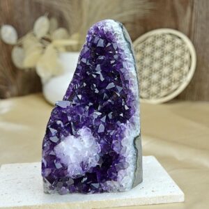 Ametyst je predovšetkým kameň duchovnej čistoty a meditácie. Prepája dušu s duchovným svetom. Jeho vyžarovanie je harmonické a uvádza do rovnováhy myseľ a cit. Je symbolom premeny. Otvára nám tajomstvá, ktorým by sme neporozumeli použitím samotného rozumu. Pomáha nám k uskutočneniu našich vízií a prináša svetlo do našich snov. V prítomnosti ametystu si vieme jednoduchšie predstaviť našu budúcnosť, vidíme súvislosti s minulosťou a chápeme príčinu a následok. Je to kameň inšpirácie. Obohacuje našu meditáciu