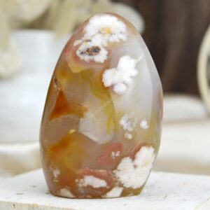 Kvetinový achát má mnoho úžasných metafyzických vlastností, ktoré podporujú vlastný rast. Najlepšie opísanou energiou prúdiacou z kvetinového achátu je „od semena po kvet“, pretože kvetinový achát vám pomôže rozkvitnúť a naplno využiť váš potenciál. Môže vám pomôcť ako ochrana pred vašimi vlastnými obavami a pochybnosťami o sebe, aby vám pomohol vyrásť. Tiež pomáha pri prejavovaní a starostlivosti o vaše sny. Jeho krásna – jemná, ženská energia podnecuje vášeň ísť za svojimi snami a žiť život naplno. Je to dokonalý kameň pre podnikateľov, ktorí dúfajú v rast a prosperitu svojho podnikania, alebo pre tých, ktorí chcú niečo nové vo svojom živote naštartovať. Podporuje libido a fyzickú výdrž. Navyšuje životný Elán. Vyvoláva hlboké spojenie a silnú lásku k sebe.