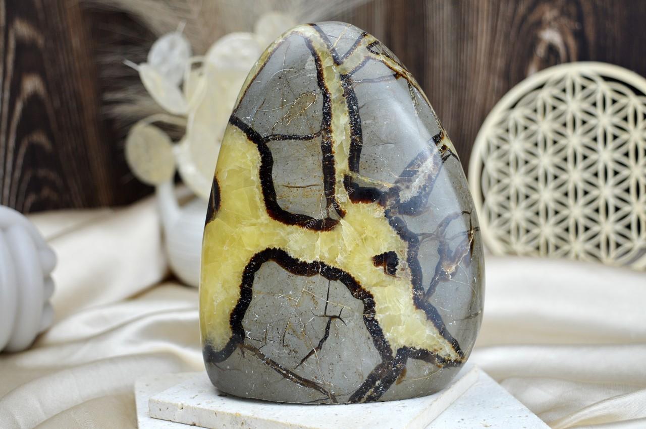 Septária- Poskytuje ochranu svojmu majiteľovi. Výborný pre podnikateľov, priaznivo ovplyvňuje úspech a finančnú hojnosť . Uvoľnuje napätie a blokády v solar plexus , harmonizuje naše Ja a pomáha nám k premene ponorením sa do seba. Uvoľnuje depresie a úzkosť. Podporuje koncentráciu, inšpiráciu, kreativitu a duchovný vývoj. Lieči psychosomatické problémy, žalúdočne vredy, harmonizuje rodinné konflikty, zlepšuje náladu a pomáha nám hľadieť dopredu s optimizmom.. Pomáha nám získať nadhľad, pragmatické myslenie, sebavedomie.
