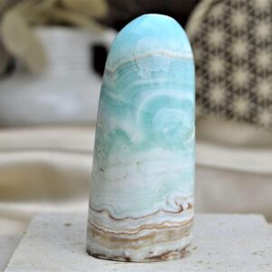 Modrý Aragonit dodáva energiu a v spojení s Matkou zemou, uzemňuje. Čistí energetické blokády. Transformuje a prečisťuje geopatogénne zóny. Učí nás trpezlivosti, ústretovosti, spoľahlivosti, toleranciu a prispôsobivosti. Pomáha v okamihoch napätia a tíši stavy nepokoja. Chráni pred citovým nátlakom a zlosťou. Ponúka posilu a podporu. Vhodný pre meditácie, podporuje duchovný rast, disciplinovanosť a spoľahlivosť. Upokojuje, prináša koncentráciu a rovnováhu. Stabilizuje základné (koreňovú) a zemskú čakru. Pomáha zakotviť ľudí s prílišným sklonom k “lietaniu v oblakoch“ v ich vlastnom tele. Jemne a citlivo nás vráti späť do detstva alebo do ešte vzdialenejšej minulosti.