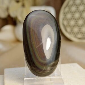 Dúhový obsidián je jedným z najjemnejšie pôsobiacich obsidiánov, ale súčasne má silné ochranné účinky. Práve keď sa nachádzame v tme ukazuje nám svetlo na cestu. Prinesie vám poznanie týkajúce sa vašej duchovnej podstaty. Dokáže pretnúť väzby spájajúce vás so starou láskou a jemne odstráni háčiky, ktoré ostatní zanechávajú vo vašom srdci, aby z vás vysávali srdečnú energiu, dúhový obsidián dokáže vstrebávať negatívnu energiu z aury a odvádzať z tela stres. Podporuje intuíciu a jasnozrivosť.